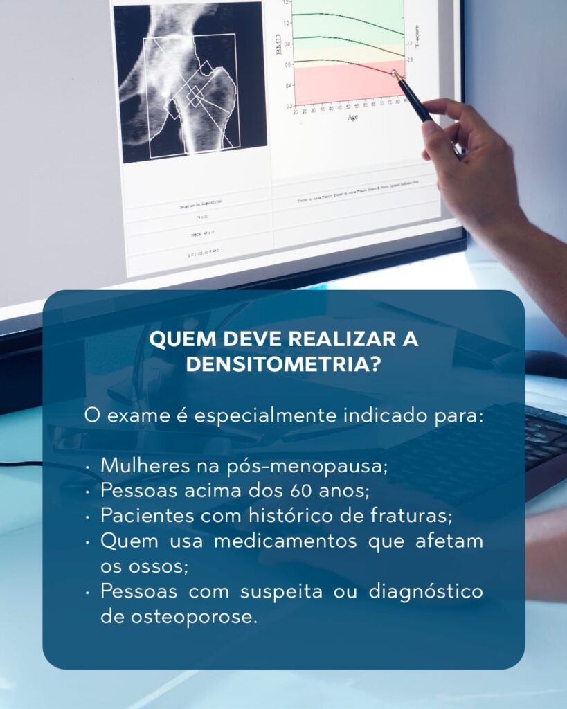 A densitometria óssea é o exame mais indicado para a avaliação da osteoporose, pois